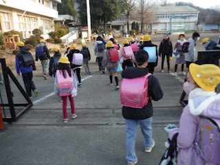 1年:図工です。黒板に「かざぐるまをつくろう」と書いてあります。